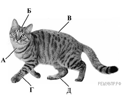 Установите соответствие между частями тела кошки, обозначенными буквами (А–Д) на рисунке, и их названиями.